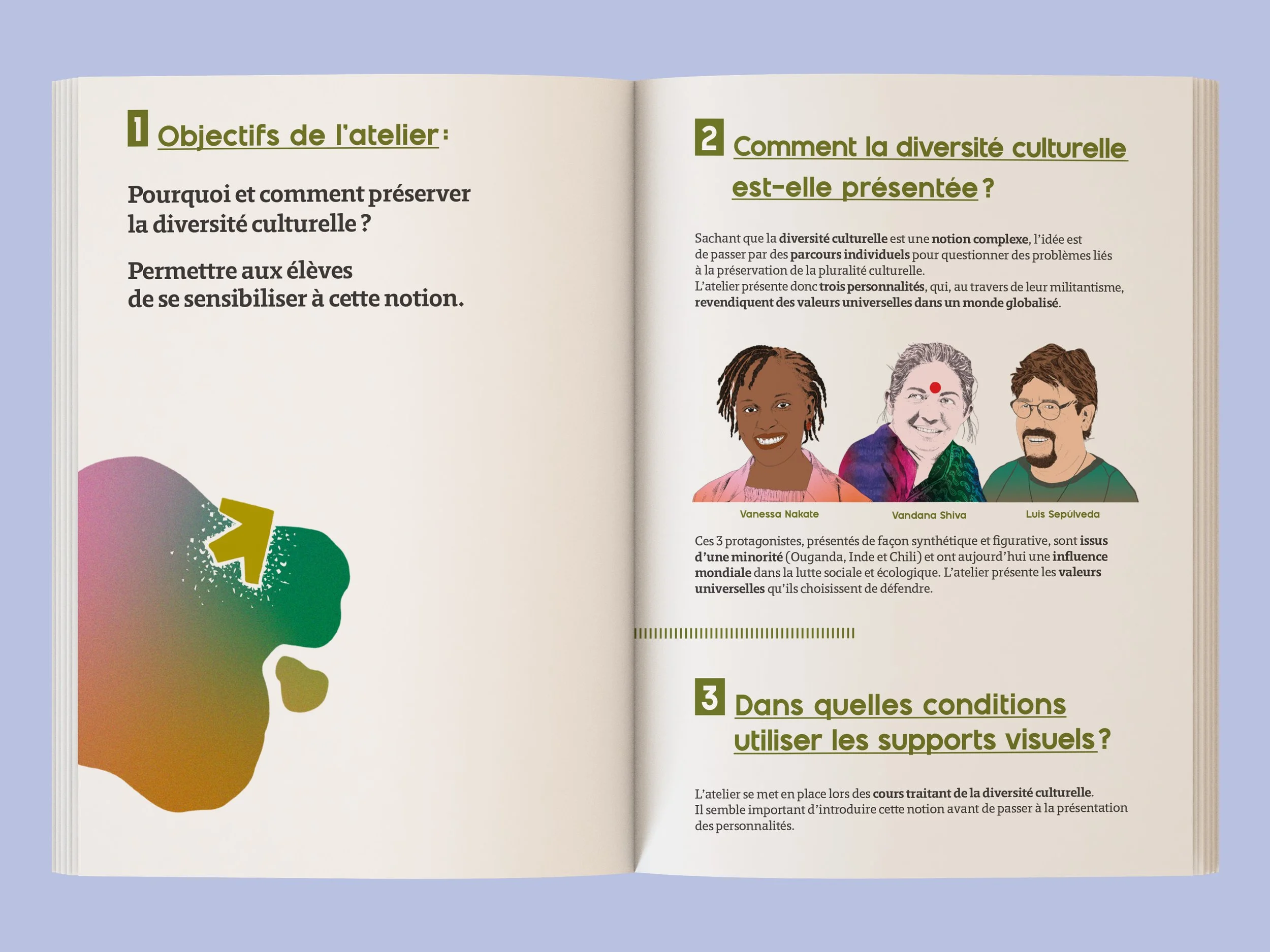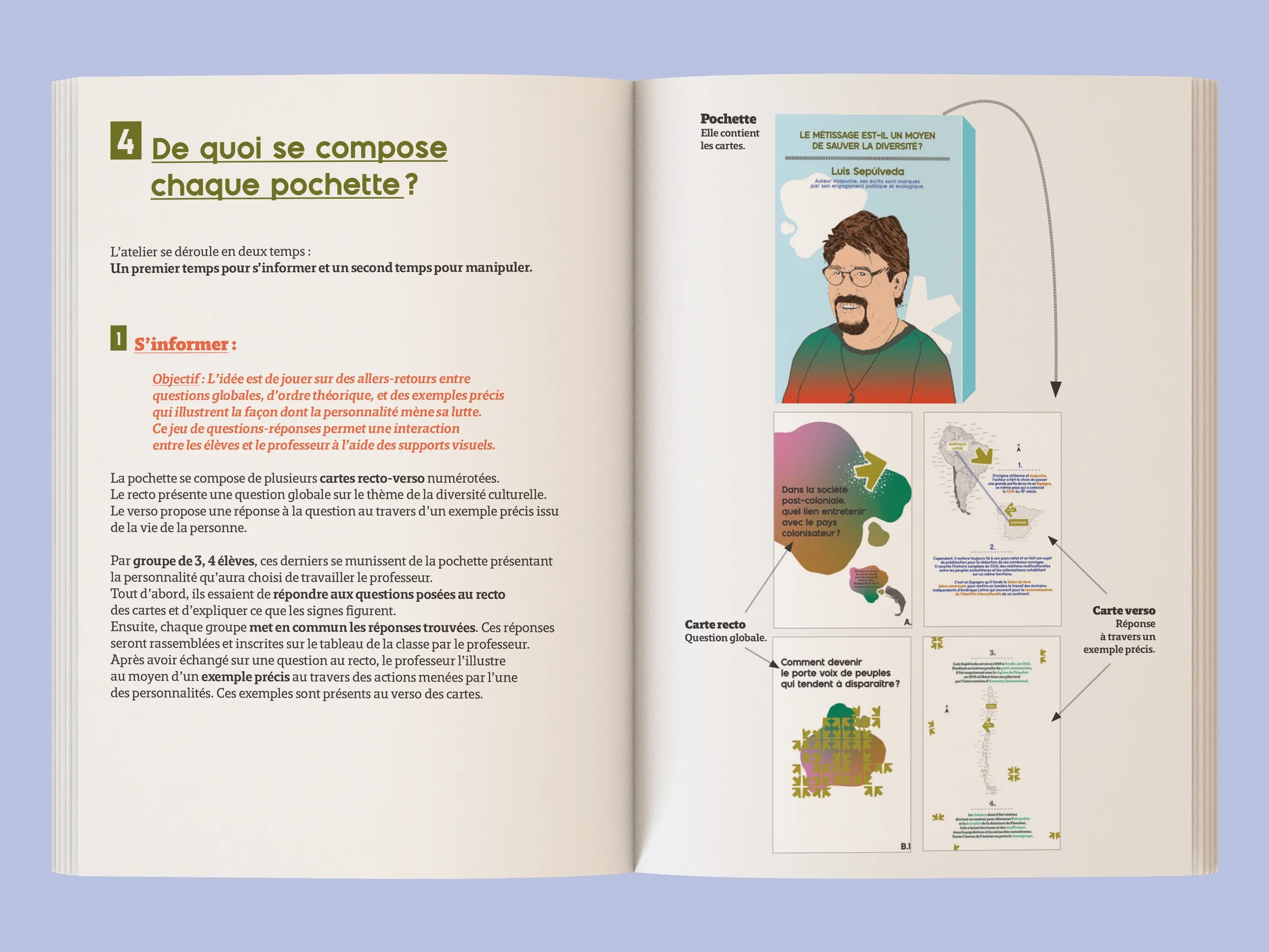 La première permet de s’informer par le biais de cartes. Le recto présente une question globale sur le thème de la diversité culturelle. Le verso propose une réponse à la question au travers d’un exemple précis issu de la vie de la personne. L’idée est de jouer sur des allers-retours entre questions globales, d’ordre théorique, et des exemples précis qui illustrent la façon dont la personnalité mène sa lutte pour permettre une interaction entre les élèves et le professeur à l’aide des supports visuels.