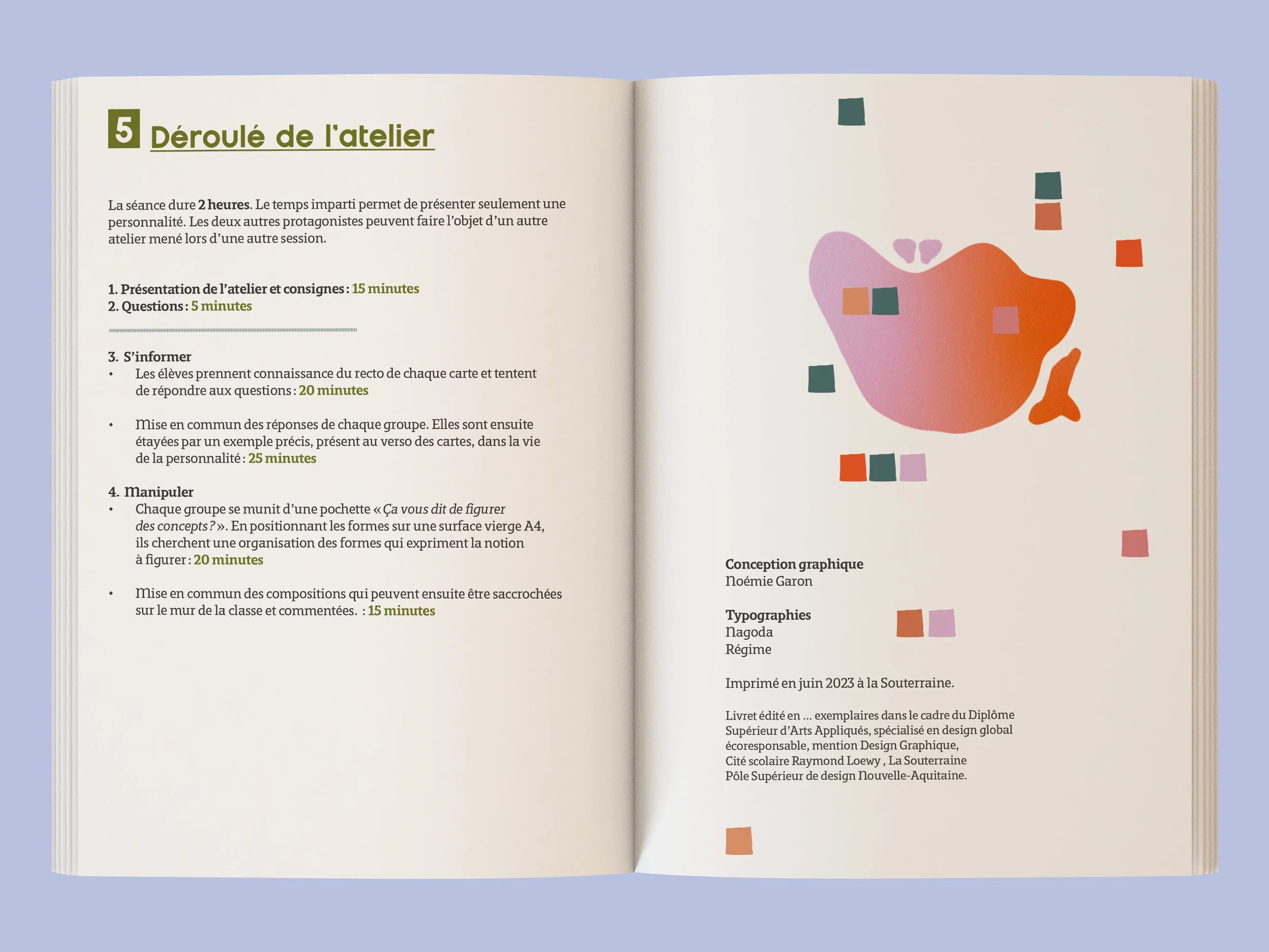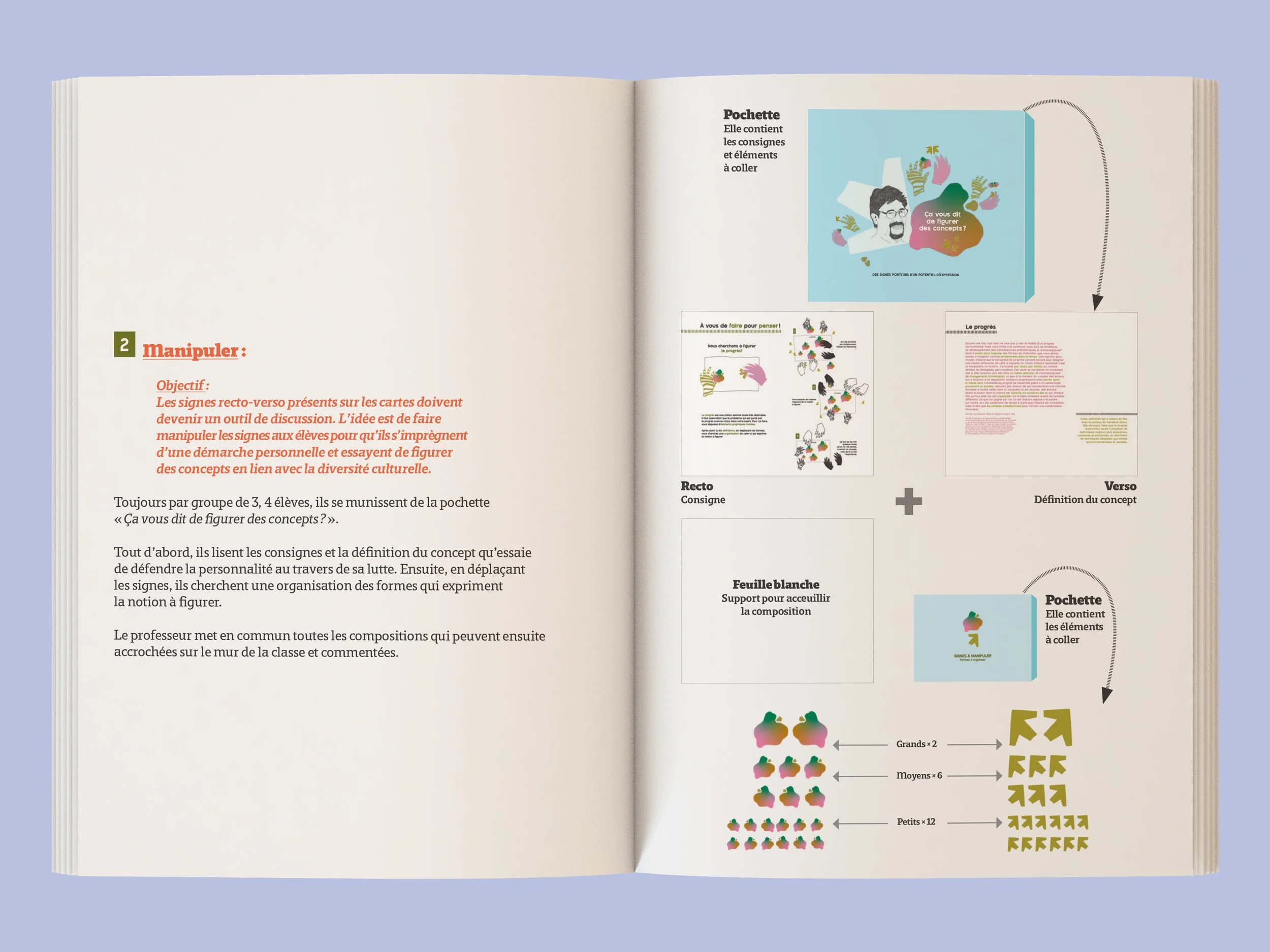 Le kit est muni d’une notice d’utilisation à l’intention du professeur. À l’intérieur sont inscrites le déroulé de la séance, de quoi sont composées les pochettes, les objectifs de chaque phase…