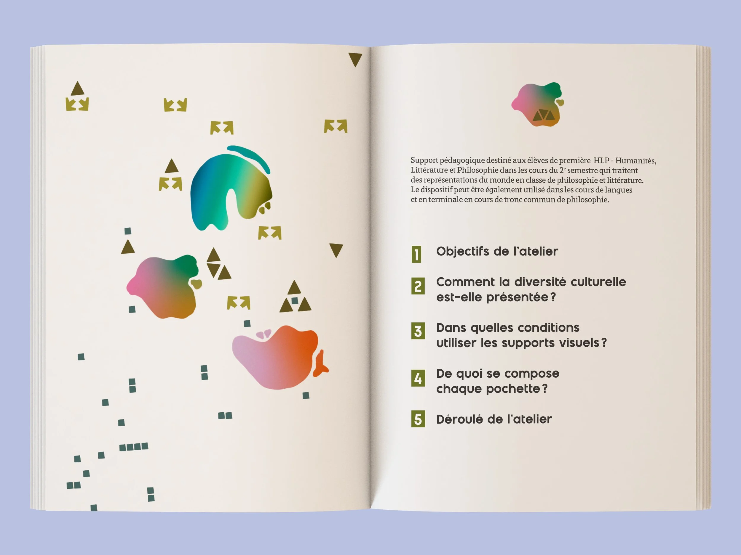 Regards croisés est une recherche du potentiel graphique qui aiderait à la compréhension de divers enjeux liés à la question de la diversité culturelle sous forme d’un support pédagogique destiné aux élèves de premières dans les cours abordant